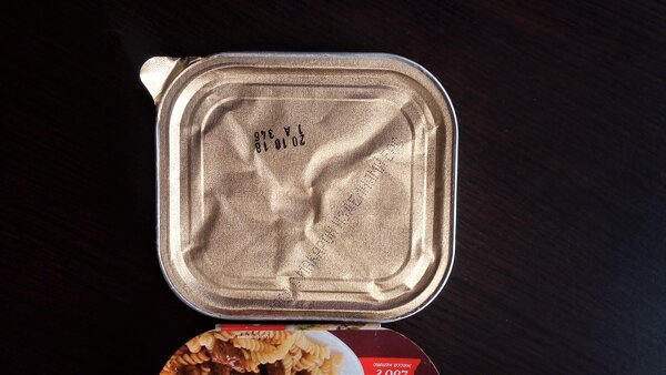Консервы упакованы в картонную коробку, под которой скрывается емкость из фольги с металлической крышкой.