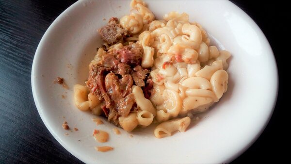 Макароны, к сожалению, сильно слиплись, и их пришлось разъединять с усилием. На вкус блюдо оказалось вполне приятным — точно как те самые макароны с тушенкой, приготовленные в походных условиях. Мясо было мягким, хорошо жевалось, и чувствовалось, что это качественная тушеная говядина. Перец добавлял легкую, ненавязчивую остроту.