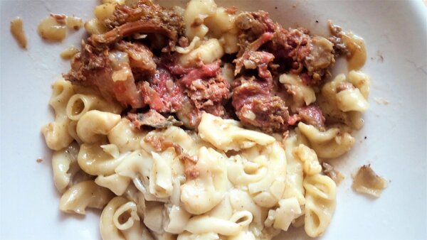 Я выложил все в тарелку и разогрел в микроволновке. Блюдо выглядело аппетитно, а его аромат напомнил нечто среднее между бешбармаком и походными макаронами с тушенкой. Однако сразу бросилось в глаза обилие жира.