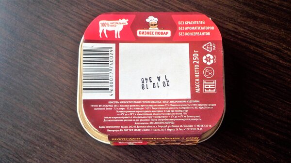 На обратной стороне я обнаружил, что это мясорастительные консервы с массовой долей мяса при закладке 35%. Сначала подумал о сое, но, как выяснилось, из растительных компонентов здесь только лук и перец — вполне приемлемо.