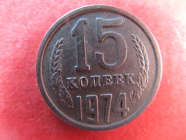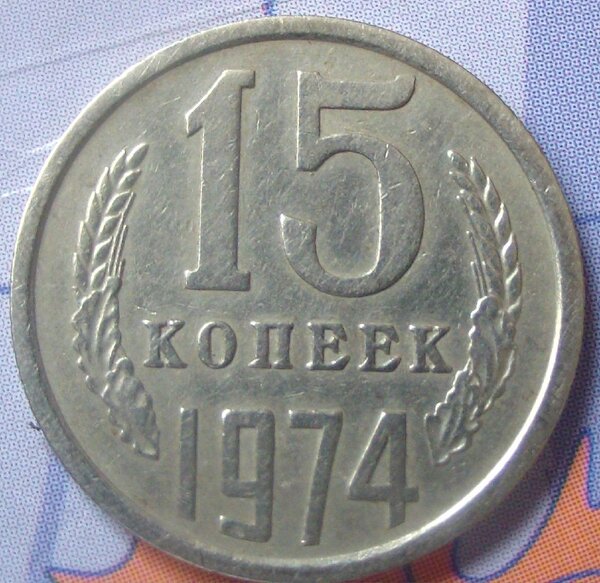 Среди советских монет выделяется экземпляр номиналом 15 копеек, датированный 1974 годом. Именно этот год отличается сравнительно небольшим тиражом выпуска, что делает монету редкой и востребованной среди коллекционеров.
