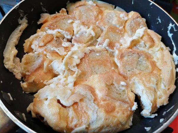 5. Заливаем яйцами. Аккуратно, тонкой струйкой выливаем яичную смесь на сковороду, стараясь, чтобы она пропитала все кусочки хлеба.