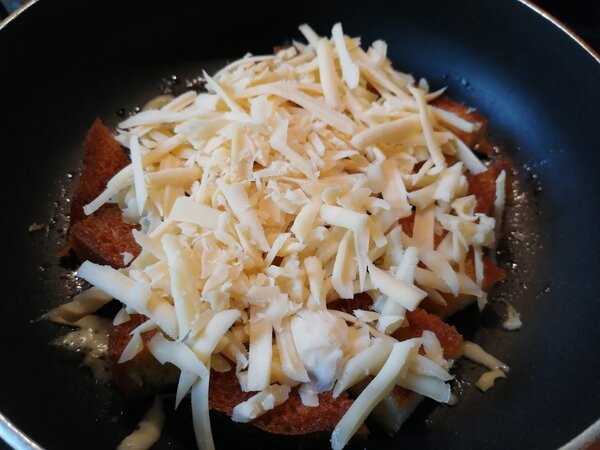 4. Собираем блюдо. Переворачиваем подрумяненные гренки на сковороде и сразу щедро посыпаем их тертым сыром.