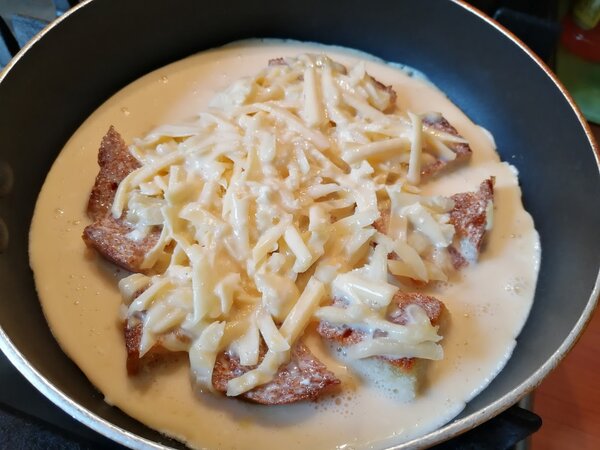 Благодаря добавлению хлеба, блюдо получается невероятно сытным и надолго заряжает энергией. А сочетание хрустящих гренок, нежного яичного «одеяла» и расплавленного сыра создает просто волшебную текстуру и вкус.