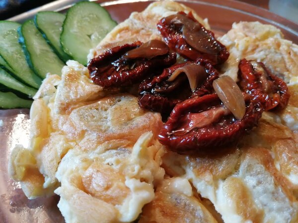 Я обожаю есть эту яичницу с квашеной капустой — получается идеальное сочетание. Но в этот раз ее под рукой не оказалось, и на помощь пришли вяленые томаты домашнего приготовления. Они невероятно вкусные! Рецепт этих помидоров очень похож на мой собственный рецепт вяленых слив, который все так хвалят.