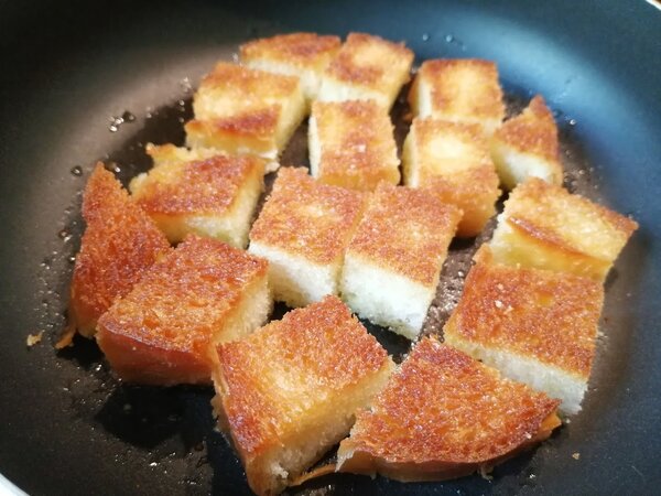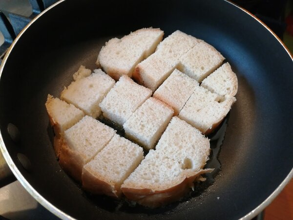 1. Подготовка хлеба. Каждый кусок хлеба нарезаем на 8 небольших квадратиков или треугольников. Разогреваем на сковороде масло (я предпочитаю оливковое) и выкладываем хлеб.