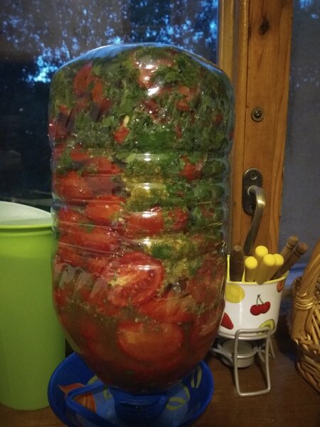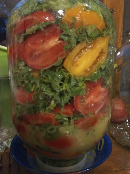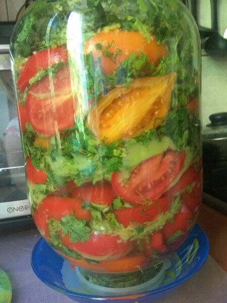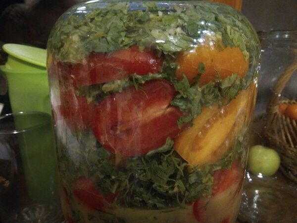 В чистую трёхлитровую банку плотно укладываем половинки помидоров, пересыпая их подготовленной зеленью с заливкой. Можно сначала уложить помидоры с зеленью, а заливку добавить в конце.