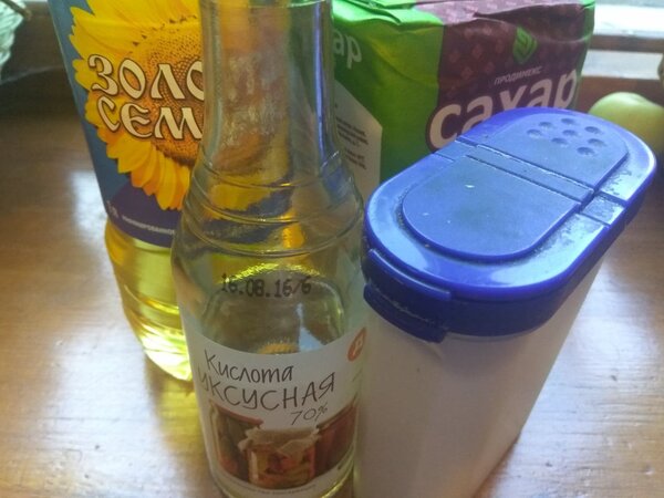 Важный лайфхак: соль и сахар плохо растворяются в уксусе и масле. Автор рекомендует сначала растворить их в 100 мл горячей воды, а затем добавить уксусную эссенцию (около 1 ст. ложки) и масло. Полученную смесь соединить с измельчённой зеленью и тщательно перемешать. Не стоит измельчать всё вместе в комбайне — заливка станет мутной и менее аппетитной на вид.
