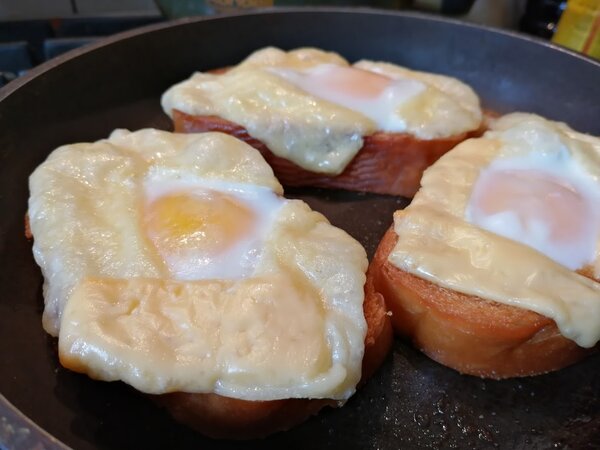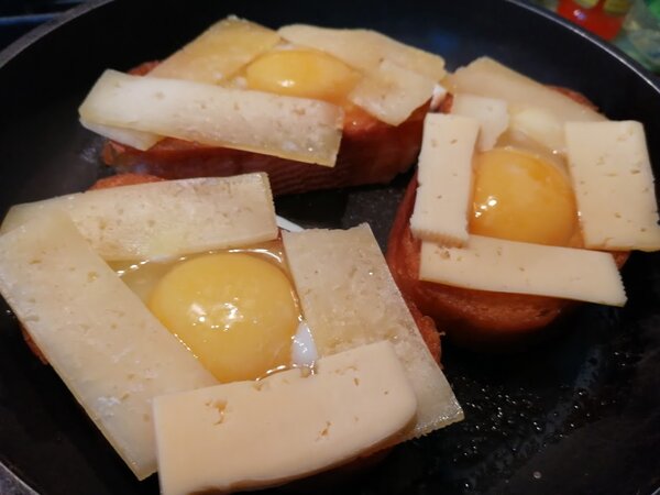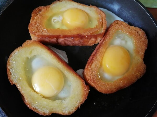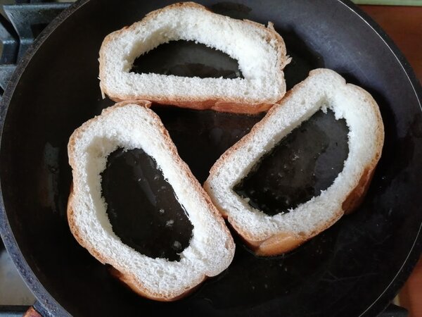 Вам понадобятся: белый хлеб, яйца, сливочное или растительное масло для жарки, а также сыр — по желанию. Количество ломтиков хлеба должно соответствовать количеству яиц. В моём случае их было три.