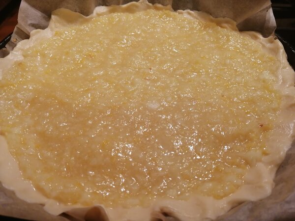 Равномерно распределите лимонную начинку по тесту. Я пробовала два способа: просто посыпать сахаром сверху и смешать его с лимонной массой заранее. Второй вариант оказался удобнее — сахар распределяется равномернее.