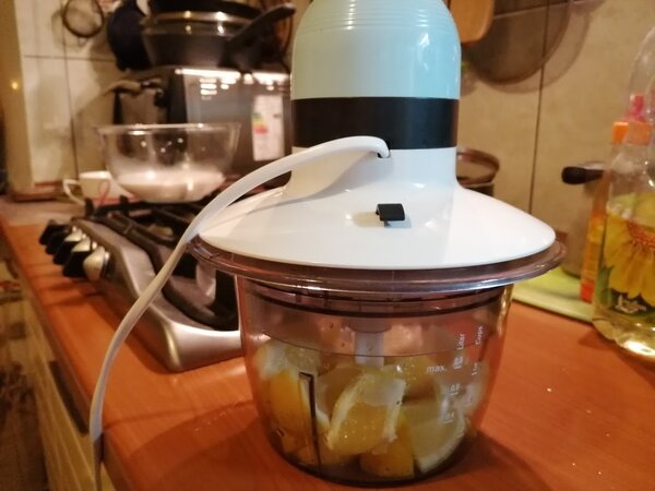 Цедру можно оставить — она даст яркий аромат и лёгкую горчинку. Если вы хотите её смягчить, лимоны стоит предварительно ошпарить кипятком. Я пользуюсь для измельчения удобным кухонным комбайном (в нашей семье его ласково называют «шапочкой»), который отлично справляется с такими задачами.