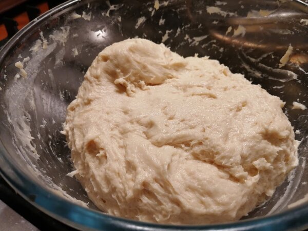 В готовую опару добавьте размягчённое сливочное масло и постепенно вводите муку. Месите до тех пор, пока тесто не станет эластичным, перестанет липнуть к рукам и стенкам миски. Оно получается очень нежным и податливым.
