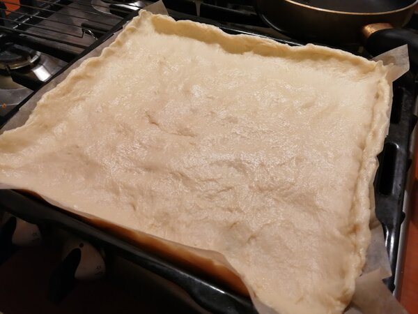 Важный совет: распределяйте тесто тонким слоем и делайте невысокие бортики. Пирог, испечённый на сковороде с толстым слоем теста, получился менее удачным — в этом рецепте тонкая основа идеальна.