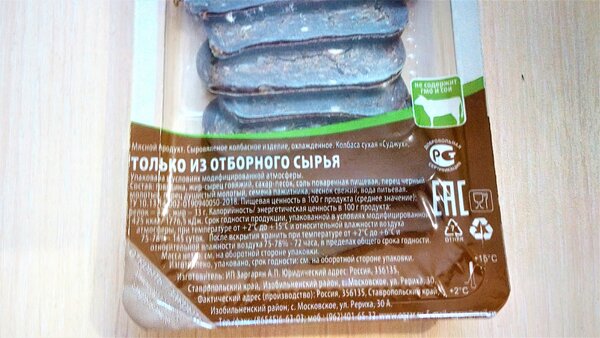 Изучаем состав: производитель заявляет об использовании отборного сырья. Основные компоненты — говядина и жир. Из специй обращает на себя внимание семя пажитника, что добавляет продукту экзотичности.