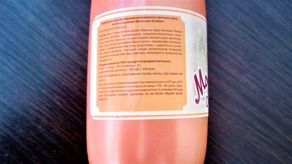 Изучение состава, как и предполагалось, не стало открытием. Основным ингредиентом значилось мясо птицы механической обвалки, а список пищевых добавок (стабилизаторов, усилителей вкуса, консервантов) был довольно длинным. Впрочем, сегодня это характерно для большинства недорогих колбасных изделий, так что мы не были разочарованы — просто констатировали факт.