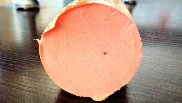 На разрезе колбаса выглядела вполне привлекательно: цвет был однородным, розоватым, без заметных кусочков жира, сухожилий или других посторонних вкраплений.
