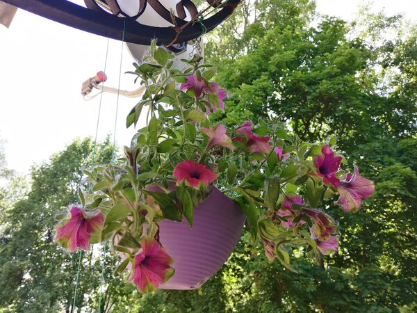 Для красоты добавила ампельные петунии. Хотела ароматный сорт, но, кажется, ошиблась с выбором. Тем не менее, они очень украшают балкон, на котором ещё осталось место, чтобы посидеть и отдохнуть.
