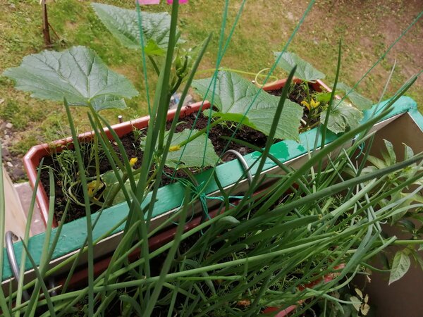 Огурцы мне подарили уже в виде рассады. Они уже цветут, но пока только пустоцветы. Посадила их так, чтобы они могли виться и создавать дополнительную зелёную стену. Мечтаю в будущем посадить вьюн, который оплетёт весь балкон.