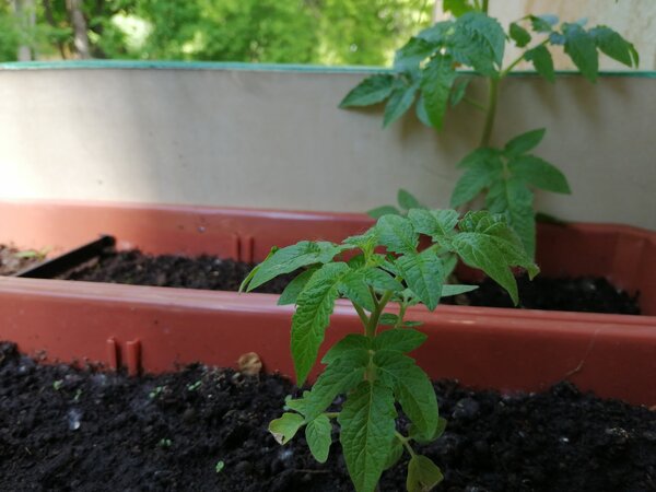 С томатами пока не всё гладко: рассаду тоже подарили, сорт должен быть низкорослым, но растения развиваются медленно. Возможно, им не хватает света — сегодня переставила их повыше.