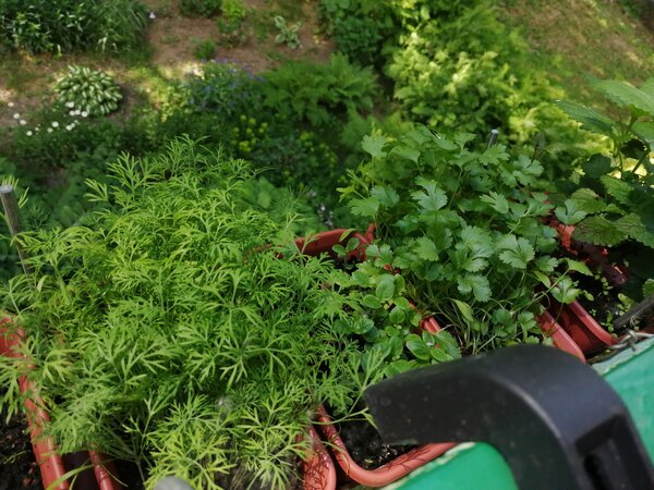 Основной упор я сделала на пряные травы и зелень: базилик, мелиссу, укроп и кинзу. Урожай, конечно, не огромный, но всегда можно сорвать немного свежей зелени для салата или чая.