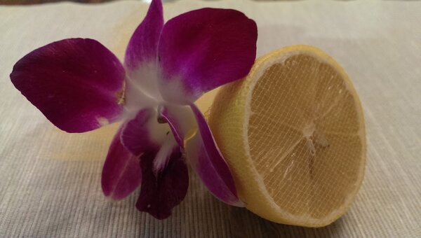 Когда разобралась, то была приятно удивлена простотой и гениальностью решения. Лимонная долька была аккуратно завернута в мелкую сеточку желтого цвета и перевязана декоративной веревочкой (орхидея служила лишь украшением).