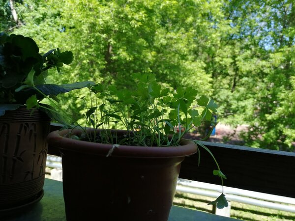 В этом году у меня появился балкон, но он очень маленький, поэтому уличные подоконники снова в деле. Вот, например, растет петрушка.
