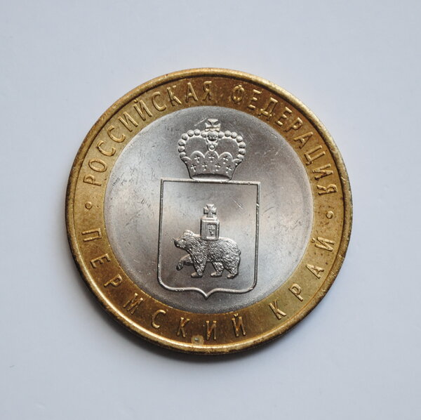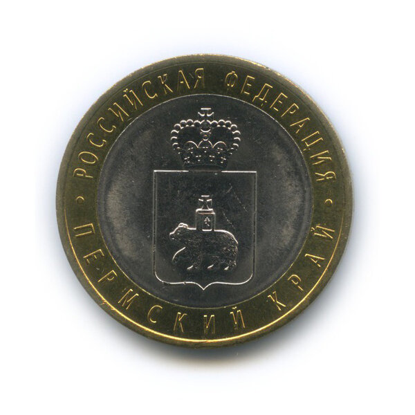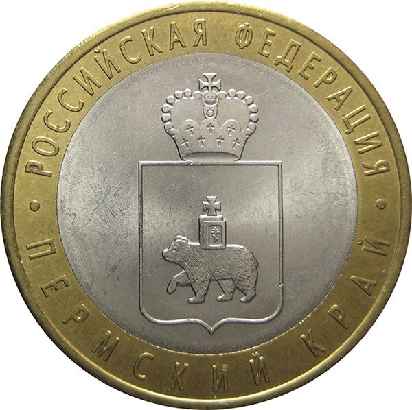 Речь идёт о монете из серии «Российская Федерация», посвящённой Пермскому краю. На её реверсе изображён герб региона.
