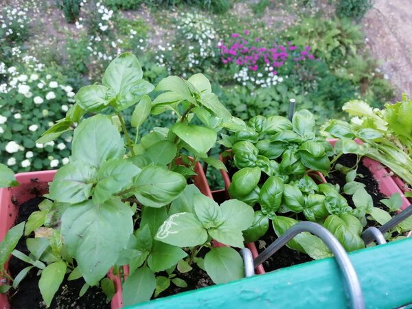 Большим сюрпризом стал базилик. Я всегда считала его капризной культурой, но на балконе он внезапно пошёл в бурный рост и даже обогнал ту рассаду, которую мне дали уже вполне взрослой.