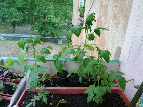 Помидоры пока выглядят немного хилыми (возможно, им не хватает подкормки), но уже готовятся зацвести.