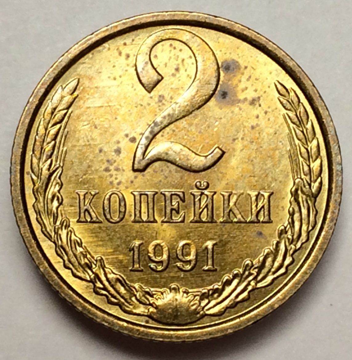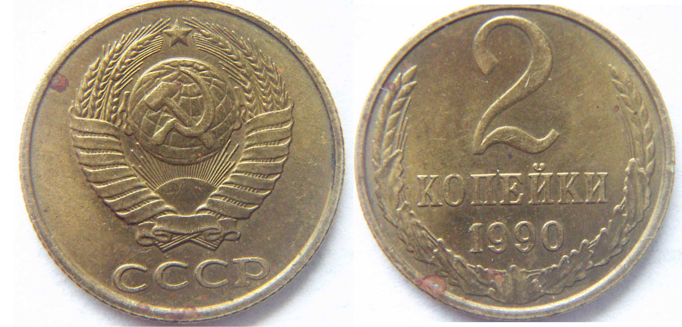 Появление буквы «М» на монетах 1990 года, в частности на 2 копейках, является следствием так называемого "штемпельного брака". На монетном дворе по ошибке использовали штемпель, предназначенный для чеканки монет 1991 года, который уже содержал буквенное обозначение двора.