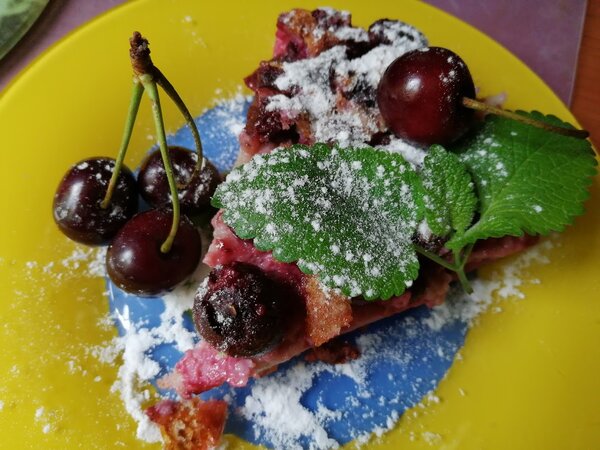 На вкус десерт получился очень похожим на манник, хотя манки в составе не было. Чувствовался также выраженный яичный вкус, что, конечно, на любителя. Ещё один момент — клафути сильно пристал к пекарской бумаге, вероятно, потому что я не смазала её маслом как следует.