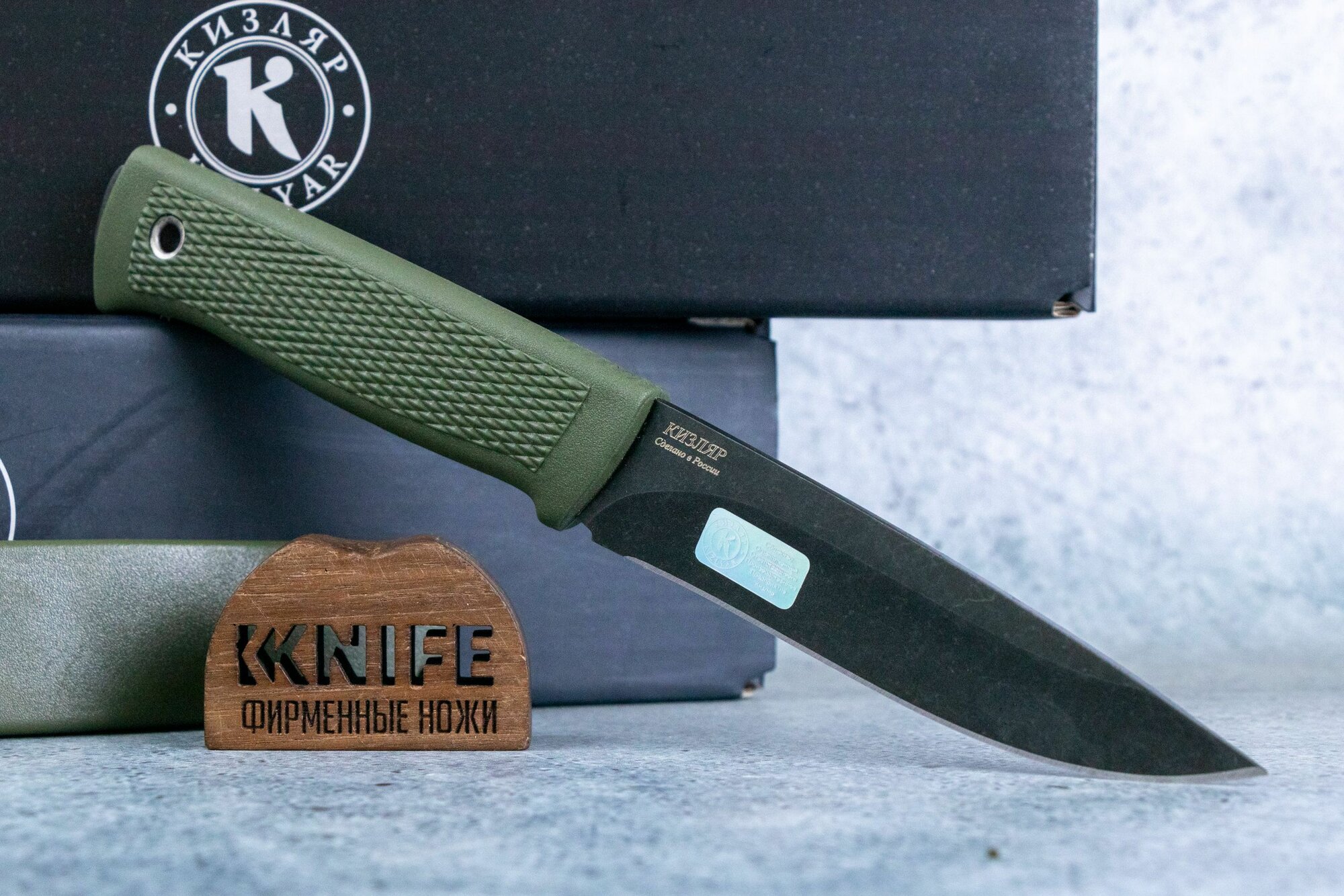 Клинок: Изготовлен из японской стали AUS-8. Эта сталь известна хорошим балансом прочности и способности долго держать заточку. При необходимости нож легко заточить обратно. Закалка на заводе «Кизляр» доводит твердость до 57 HRC. Главный потенциальный недостаток этой стали – склонность к точечной коррозии – здесь нивелирован за счет нанесенного воронения, которое надежно защищает металл от ржавчины.