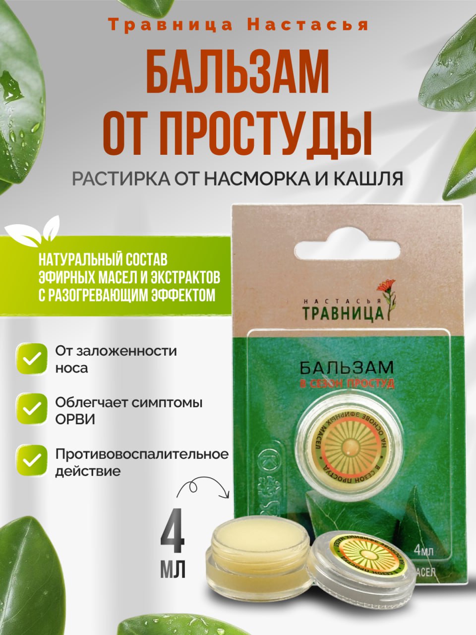 Для облегчения насморка: Аккуратно нанесите немного мази на кожу возле крыльев носа. Пары эфирных масел будут мягко воздействовать на дыхательные пути, снимая отёк и заложенность.