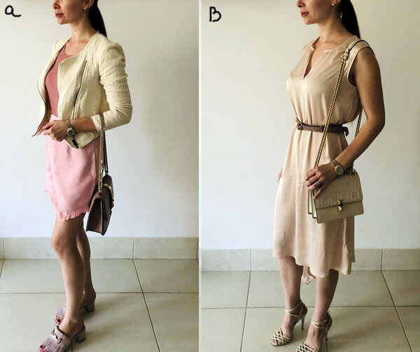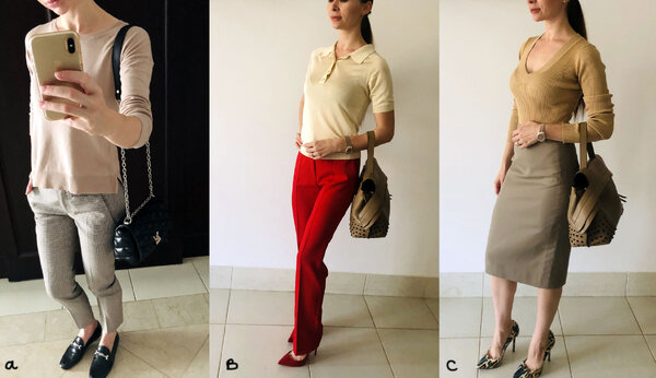С офисным стилем у меня не всегда складывается, но образ под буквой a нравится мне больше остальных. Здесь хочется отметить важность выбора сумки: сумки среднего и маленького размера смотрятся на невысоких девушках гораздо гармоничнее. Объёмные сумки, даже самой стильной формы, могут добавлять визуальной тяжести и нарушать пропорции, особенно если носить их на сгибе локтя.