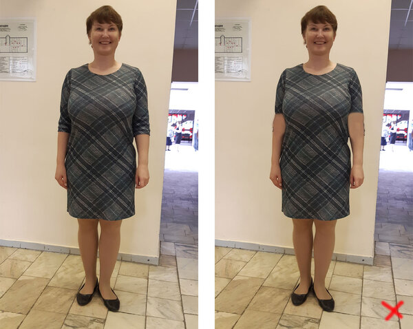 Рукавам часто не уделяют должного внимания, а ведь они играют огромную роль в создании пропорций. Рядом с пышной грудью короткие рукава (особенно выше локтя и тесные) могут диссонировать. Екатерина интуитивно верно выбрала длину. Также стоит с осторожностью относиться к сложным фасонам рукавов: буфам, «фонарикам», реглану и т.д.