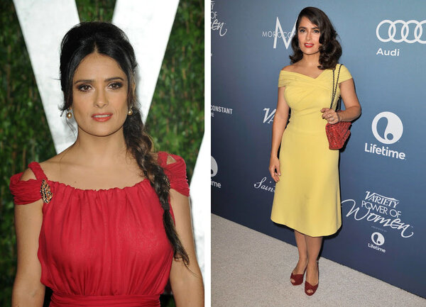 2. Вырезы и драпировки. Присмотритесь к интересным вырезам, например, «лодочке». Фасон, как на красном платье слева, может стать находкой: легкая присборенная ткань в сочетании с таким вырезом балансирует пропорции, а нежные рукава поддерживают конструкцию, не утяжеляя ее и позволяя скрыть бретельки белья. Это одновременно элегантно и сексуально.