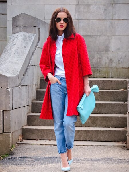 Сочетание синего и красного — одно из самых любимых и часто используемых стилистами. Этот дуэт создает эффектный, но сбалансированный контраст. Например, образ из синих джинсов, красной куртки и туфель на каблуке выглядит одновременно сексуально, уверенно и элегантно, не переходя границы вульгарности.