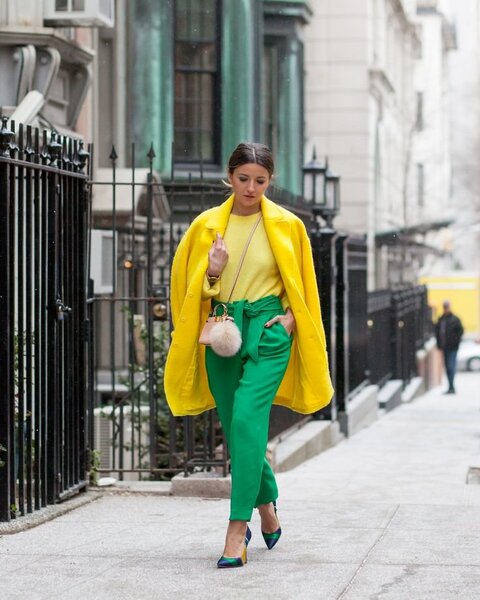 Чистые оттенки зеленого и желтого идут большинству. Например, шикарный желтый пиджак можно сочетать с простыми серыми джинсами или юбкой. Добавьте к этому комплекту белую рубашку — и вы получите яркий, свежий и идеальный повседневный look.