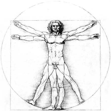 Человек вписан одновременно в квадрат и круг. Этот рисунок демонстрирует, что у пропорционально сложенного человека, стоящего с раскинутыми руками и ногами, точки касания ладоней и ступней образуют идеальную окружность.