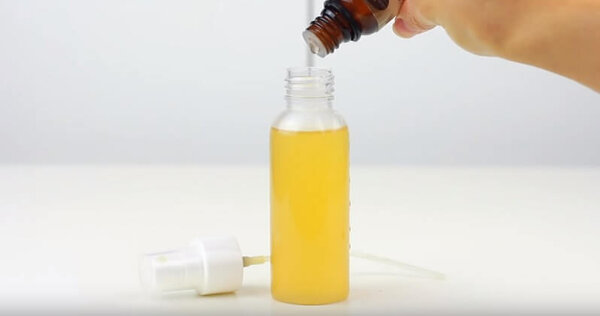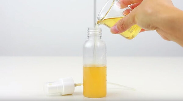 3. Добавьте к уксусу 85 мл остывшего отвара зелёного чая. Если вы решили использовать эфирные масла, сейчас самое время добавить 3 капли выбранного масла (чайного дерева или ладана).