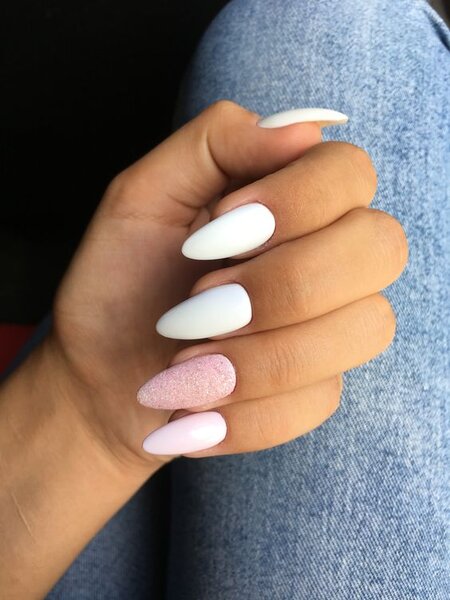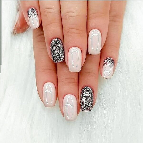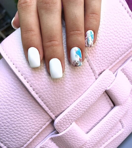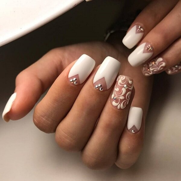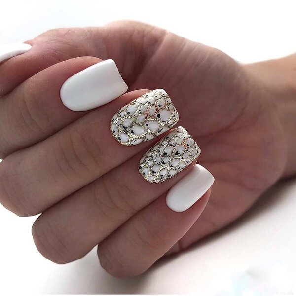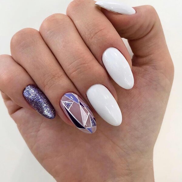 Если простые геометрические узоры кажутся вам слишком обыденными, но вы хотите сохранить белый цвет, обратите внимание на глиттер и эффект «битого стекла». Эти техники добавят ногтям блеска и праздничного настроения.