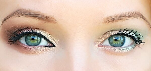 Для дневного образа я использовала комбинацию зелёных, золотистых и оранжевых теней, чтобы создать свежий и лёгкий look. Для вечернего варианта задействовала все оттенки из палетки: золотистые, розоватые, коричневые и серые, что позволило добиться более глубокого и драматичного эффекта. Вот как это выглядит на практике: