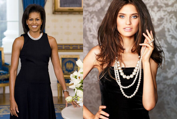 Черный цвет по-прежнему остается беспроигрышным фоном для жемчуга. Он выгодно оттеняет переливы бусин, а сам жемчуг, в свою очередь, смягчает иногда слишком строгое воздействие черного цвета на лицо.