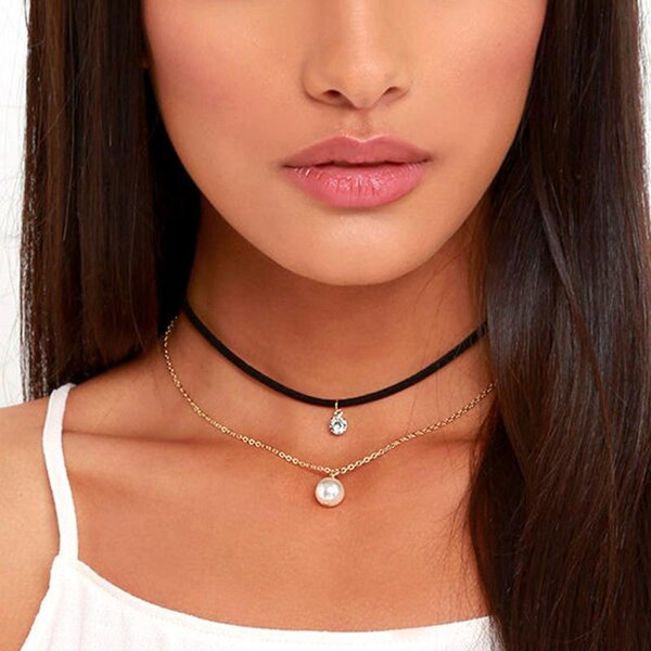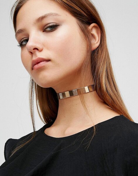 Чтобы создать уникальный многослойный комплект, к золотому чокеру можно добавить ожерелье с медальоном или украшение с темным драгоценным камнем.