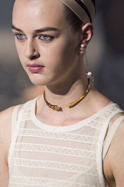 Еще одним интересным направлением стали чокеры в виде ободка или обруча. Их можно было увидеть на показах Dior (минималистичные модели с буквами) и Fendi (более причудливые и красочные, украшенные цветами).