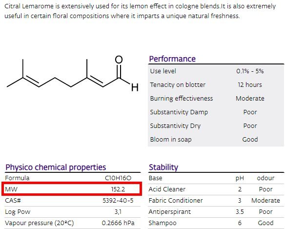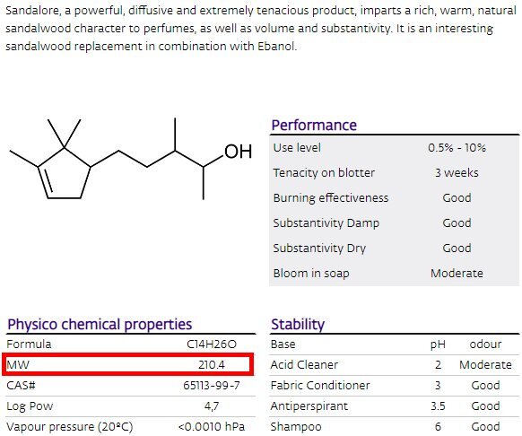 Рассмотрим наглядный пример. Возьмем цитраль (аромат лимона) и сандалор (древесный аккорд сандала). Данные из базы ингредиентов Givaudan показывают: