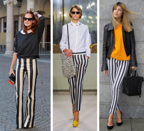 Вертикальные линии — настоящая находка для миниатюрных девушек. Брюки с таким принтом творят чудеса, визуально вытягивая ноги и добавляя роста. Ширина полоски тоже имеет значение: если у вас пышные бедра, лучше остановиться на полосках средней ширины — они создадут более гармоничный эффект.
