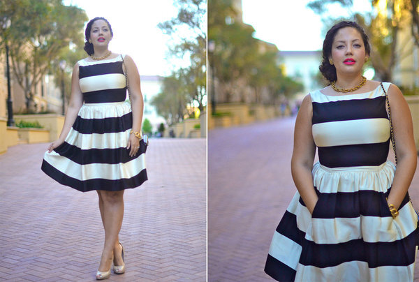 Однако есть и удачные примеры! Посмотрите на это платье с горизонтальной полоской, которое носит модель plus-size. Секрет его успеха — в четком акценте на талии. Такой фасон становится универсальным и подходит практически для любого типа фигуры. Дополните образ туфлями на каблуке — и вы получите безупречный лук.