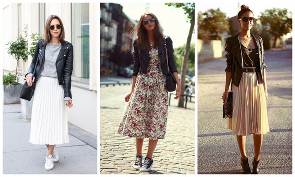 - Косуха, символ бунтарского духа, приобретает новое звучание в паре с воздушной юбкой-плиссе или романтичным платьем. Этот контраст выглядит очень современно.