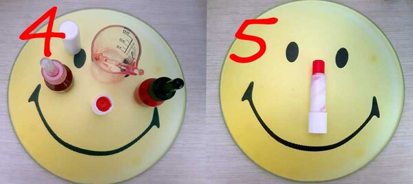 2. Формирование основы. Добавьте к масляной смеси стик гигиенической помады. Если вы используете твердый краситель (кусочек помады или карандаш), добавьте его на этом же этапе.